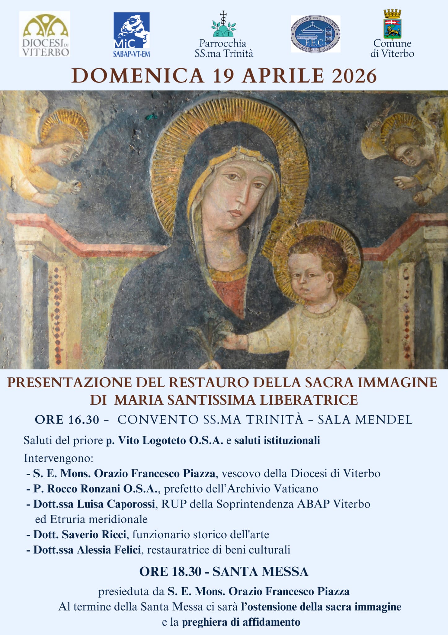 Domenica 19 aprile, alle ore 16.30, all’interno della Sala Mendel del Convento SS.ma Trinità avverrà la presentazione del restauro della Sacra Immagine di Maria Santissima Liberatrice.