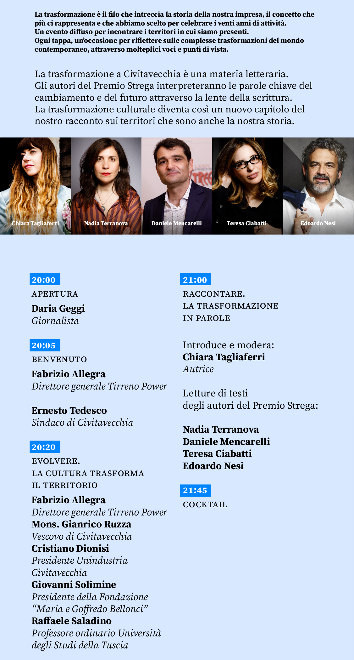 A Civitavecchia il prossimo 12 luglio a partire dalle 19.15 presso la Cittadella della Musica, in via Gabriele D’Annunzio, 2 si parlerà di trasformazione, il tema che Tirreno Power ha posto come filo conduttore di una serie di incontri sui territori in cui è presente.