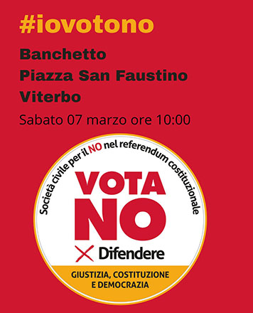 Sabato 7 marzo, a partire dalle ore 10.00, in piazza San Faustino, a Viterbo, sarà allestito un banchetto informativo del Comitato provinciale di coordinamento per il NO al Referendum sulla Giustizia durante il quale i promotori spiegheranno perché la riforma della Giustizia non risolverà nessuno dei problemi del Paese mentre accelererà la torsione autoritaria messa in atto dal Governo.