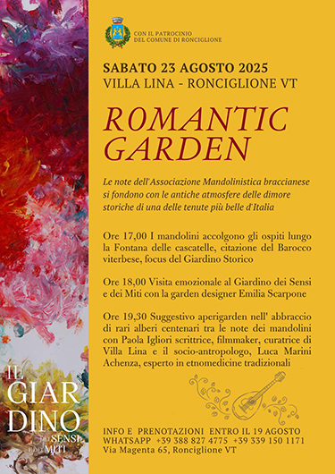 Un appuntamento nella meravigliosa Villa Lina a Ronciglione, l’associazione mandolinistica braccianese interverrà sabato 23 agosto all’evento Romantic Garden. Sarà il suono dei mandolini ad accogliere alle ore 17.00 gli ospiti lungo la Fontana della cascatelle. A seguire, alle ore 18.00, la visita emozionale al Giardino dei Sensi e dei Miti con la garden designer Emilia Scarpone. Alle 19.30 aperigarden con la impeccabile padrona di casa Paola Igliori.