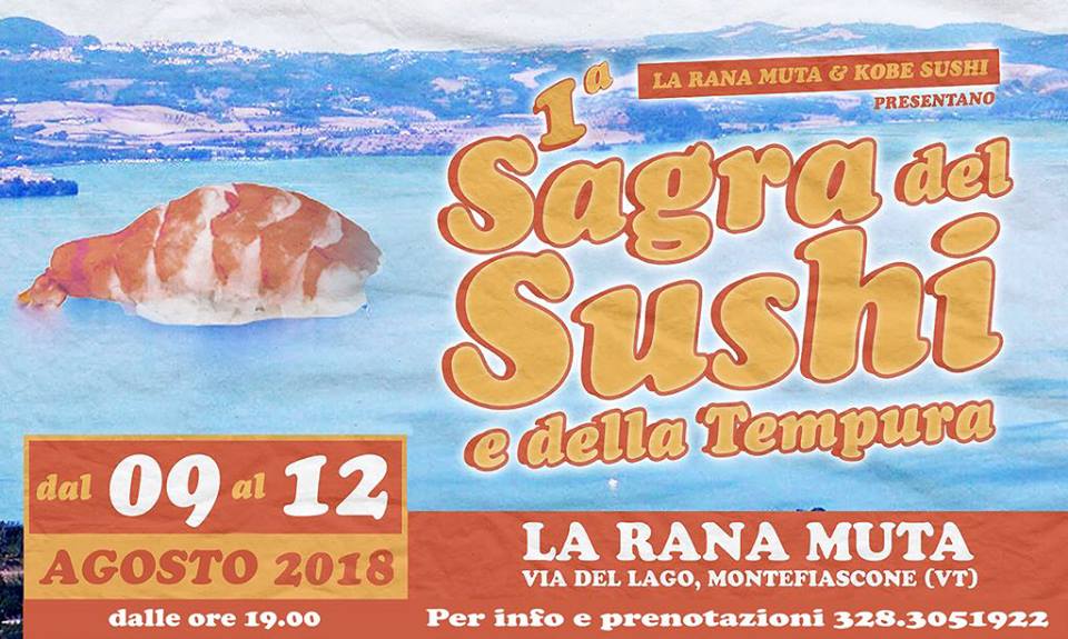 Dal 9 al 12 Agosto p.v. dalle ore 19 presso LA RANA MUTA in via del lago a Montefiascone si terrà la primissima edizione della tanto attesa SAGRA DEL SUSHI E DELLA TEMPURA. L’evento nasce dalla collaborazione già riuscita del ristorante giapponese KOBE SUSHI di Viterbo e LA RANA MUTA suggestivo locale sul lago di Bolsena .