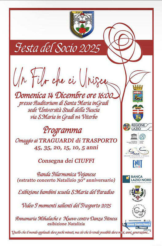 Domenica 14 Dicembre, Ore 16.00. presso l’Auditorium di Santa Maria in Gradi a Viterbo si svolgerà la Festa del Socio per celebrare  uomini, storia,  identità.