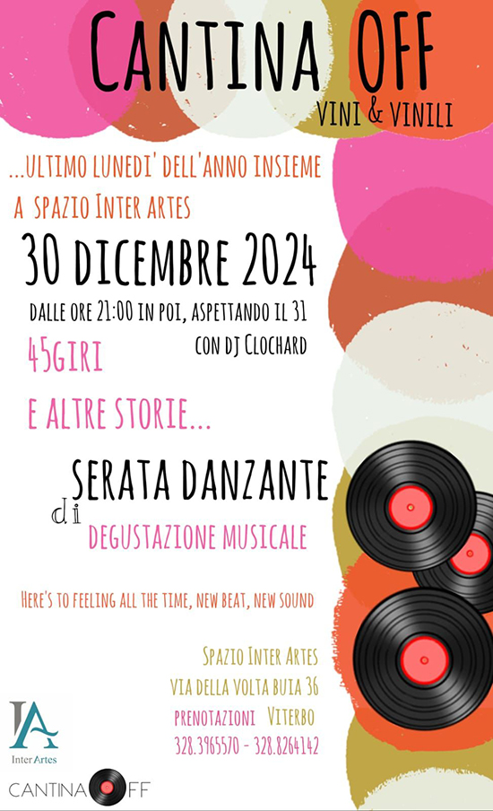 Sempre originale la sua musa ispiratrice, Barbara Aniello, nel mettere a punto eventi di spessore nel suo Palazzetto della Cultura, al centro di Viterbo. Per l’ultimo lunedì dell’anno, il 30 dicembre, un appuntamento corale con amici vecchi e nuovi dello Spazio Interartes a tema: “Cantina off vini e vinile“, dalle 21.00 in poi con il dj Clochard, 45 giri e altre storie. Una serata danzante di degustazione musicale.