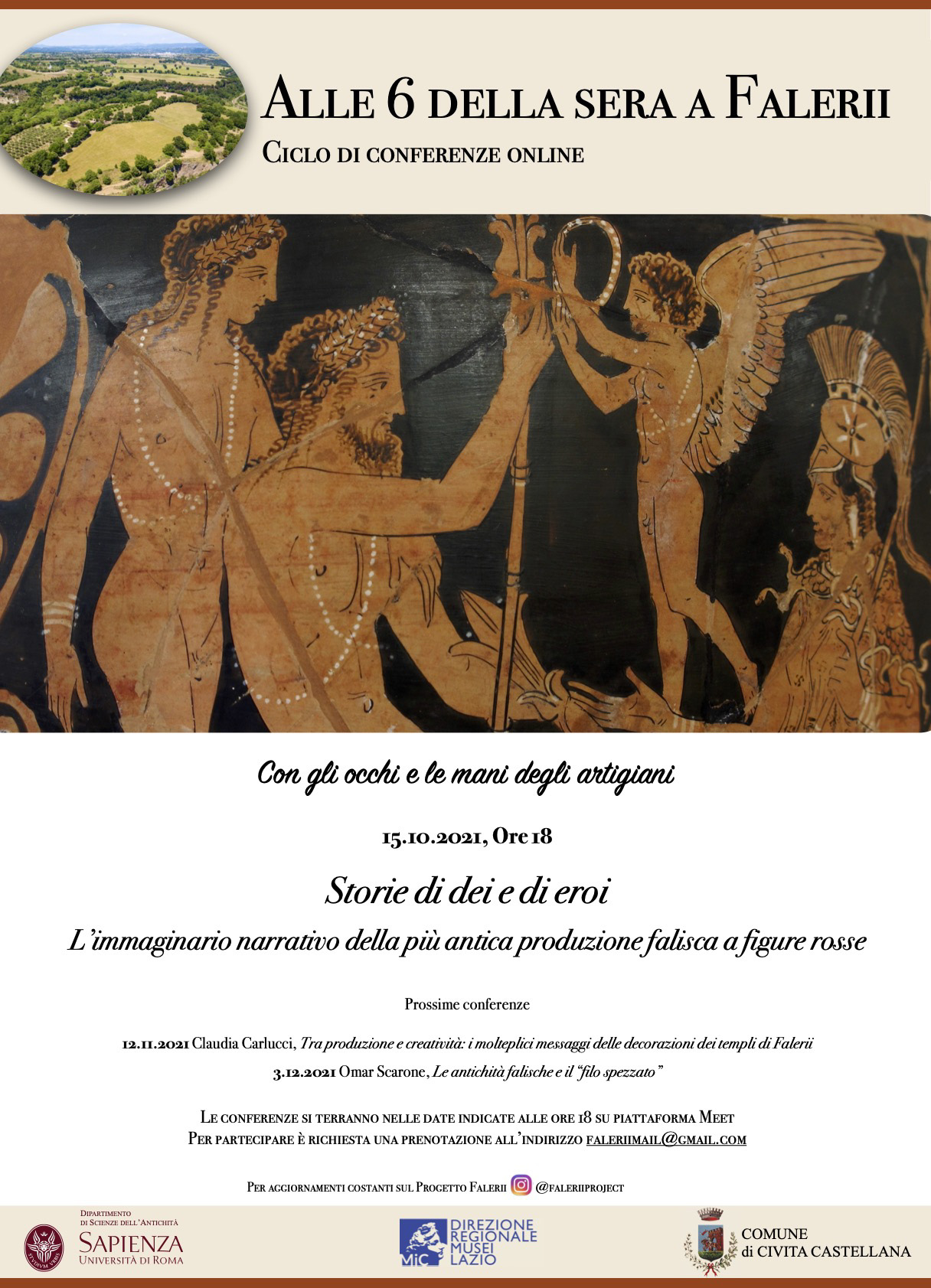 Dopo la pausa estiva, dal mese di settembre sono stati ripresi gli appuntamenti con ciclo di videoconferenze “Alle 6 di sera a Falerii”, organizzate dal comune di Civita Castellana in collaborazione con il dipartimento di Scienze dell’Antichità della Sapienza Università di Roma e il Museo archeologico dell’Agro Falisco (Direzione Regionale Musei Lazio). Ancora e fino a fine anno, per un venerdì al mese alle ore 18.00, sarà possibile “incontrarsi” collegandosi ad un’aula virtuale e seguire comodamente, da ovunque ci si trovi, gli incontri narrativi e illustrativi. Il prossimo appuntamento è previsto per venerdì 15 ottobre, alle 18.00, con un incontro dal titolo “Storie di dei ed eroi, l’immaginario narrativo della più antica produzione falisca a figure rosse – Con gli occhi e le mani degli artigiani”, volto a presentare le ricerche più aggiornate sul ricchissimo artigianato artistico dell’antica Falerii. La storia narra infatti che agli inizi del IV secolo a.C., nell’antica città di Falerii prese avvio una straordinaria produzione ceramica a figure rosse, originata dal trasferimento di artigiani greci che spostano qui le loro botteghe per soddisfare una ricca clientela, già da decenni destinataria del mercato di vasi prodotti ad Atene. Aggiornata alle conquiste dell’arte greca del periodo classico, questa produzione è divenuta veicolo di diffusione nell’area di un nuovo linguaggio stilistico e di nuovi modelli provenienti dalla Grecia. Ricostruendo l’operato dei pittori, l’origine e l’evoluzione delle botteghe ci si è accorti però di come presto, dal repertorio iconografico di partenza, si fosse sviluppato un nuovo linguaggio figurativo, a selezionare e adattare temi e soggetti alle esigenze della committenza locale.