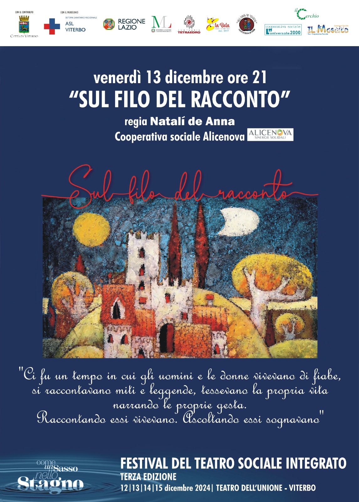 Venerdì 13 dicembre, ore 21  il sipario si apre con  “Sul filo del racconto” messo in scena dalla Cooperativa sociale Alicenova, regia Natalí de Anna.