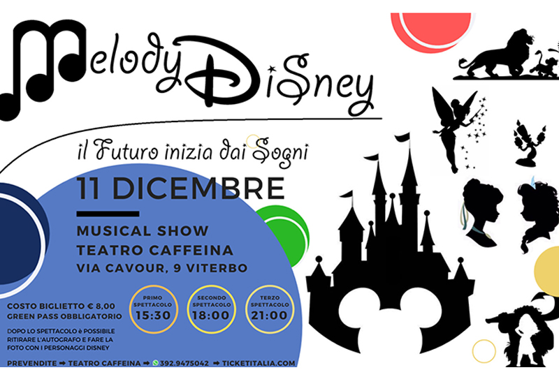 Sabato 11 dicembre presso il Teatro Caffeina di Viterbo con MelodyDisney, il futuro inizia dai sogni. Si tratta dello show, patrocinato dal comune di Viterbo, è studiato e realizzato per regalare un viaggio fatato, emozionante e spensierato per tutta la famiglia. Un appuntamento dedicato a grandi e piccini, a mamme e papà, a nipoti e a nonni di tutte le età.