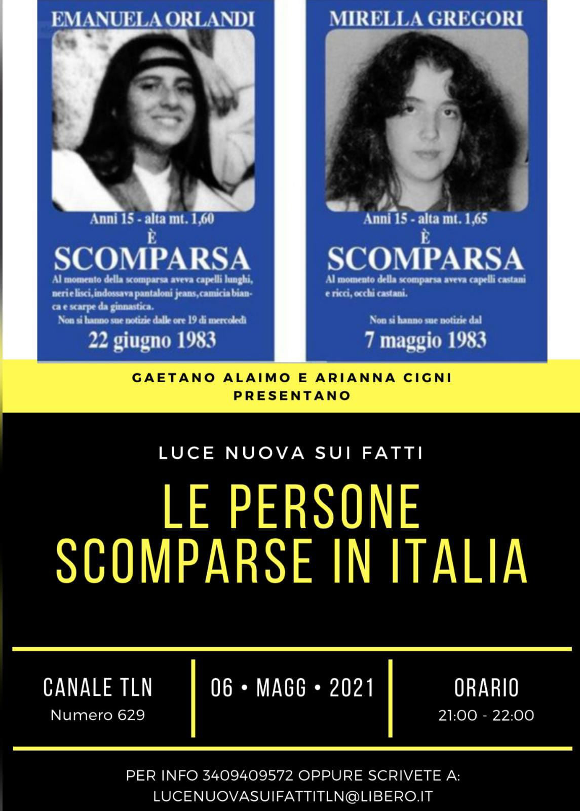 Luce Nuova sui fatti, la 18a puntata di giovedì 6 maggio dedicata a “Le persone scomparse in Italia: una ricostruzione storica”. La cronaca nazionale torna come da format nella prima settimana del mese della trasmissione, ideata e condotta da Gaetano Alaimo con Arianna Cigni. Si parlerà in questa puntata dei casi nazionali più importanti di persone sparite nei vari decenni del nostro secolo, con approfondimento particolare per i casi di Mirella Gregori, a 38 anni esatti dalla scomparsa, e di Emanuela Orlandi.