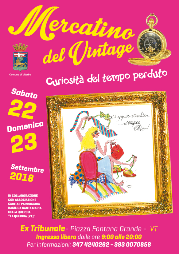 Riparte il consueto appuntamento viterbese con  il vintage, dopo la pausa estiva. Appuntamento con  il Mercato del Vintage  sabato 22 e domenica 23 settembre presso l’ex tribunale in Piazza Fontana Grande, in collaborazione con Caritas , parrocchia  Santa Maria de La Quercia………. per info 3474240262 Ingresso libero.