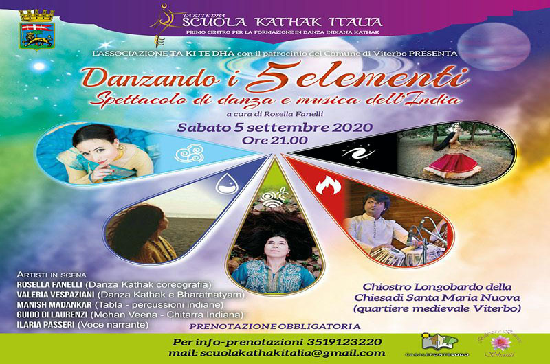 Il terzo momento sarà lo spettacolo, sempre sul tema dei cinque elementi, sabato 5 settembre alle 21.00, nel chiostro longobardo della Chiesa Santa Maria Nuova, pensato per restituire agli spettatori, attraverso l’arte millenaria come quella indiana, uno spazio energetico fatto di rituali e musiche tradizionali, frutto di un’esperienza di ricerca che crea così un ponte e un dialogo tra occidente e oriente, mettendo in risalto le possibili similitudini tra culture arcaiche.