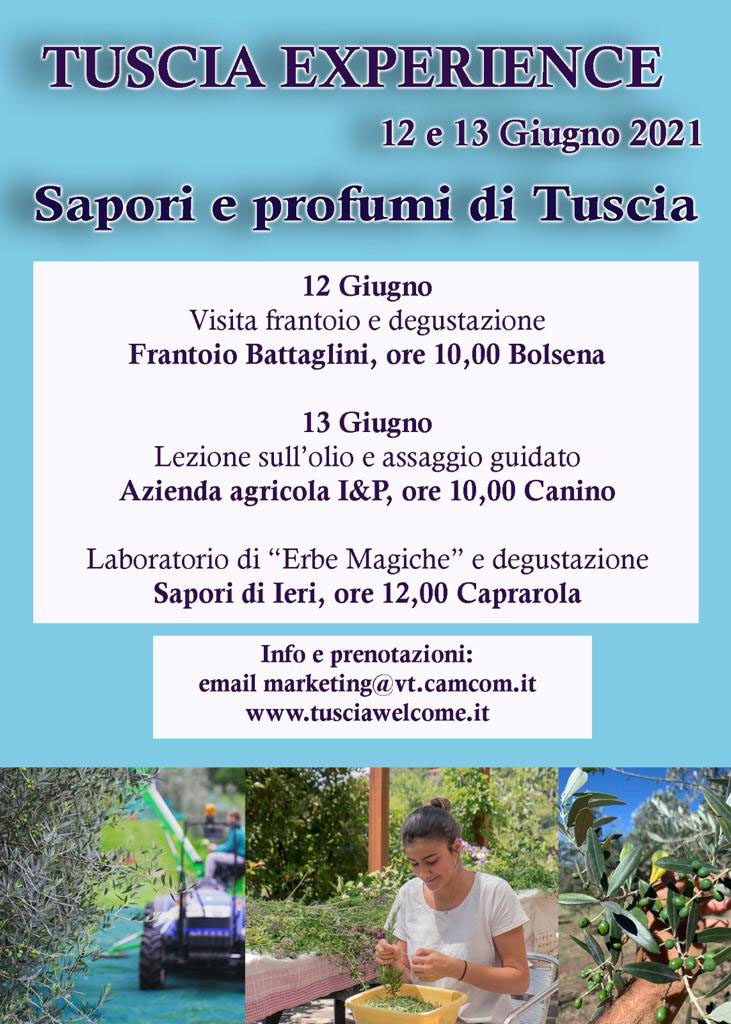 Siamo a una nuova tappa di Tuscia Experience, modello di cultura del territorio basato sul turismo sostenibile promosso da Camera di Commercio di Viterbo e Union Camere, con un originale percorso tra i borghi e le campagne di Bolsena,Canino,Caprarola, nel secondo fine settimana di giugno. Tre gli appuntamenti, s’inizia di prima mattina sabato 12 alle ore 10.00 con visita e degustazione al Frantoio Battaglini di Bolsena, mentre domenica 13 una lezione sull’olio con assaggio guidato, presso l’azienda I&P, l’appuntamento è per le 10.00.Mentre alle 12.00 a Caprarola si potrà scegliere il laboratorio delle erbe magiche con degustazioni e sapori di ieri. Insomma, un viaggio esperienziale alla riscoperta dei cinque sensi.