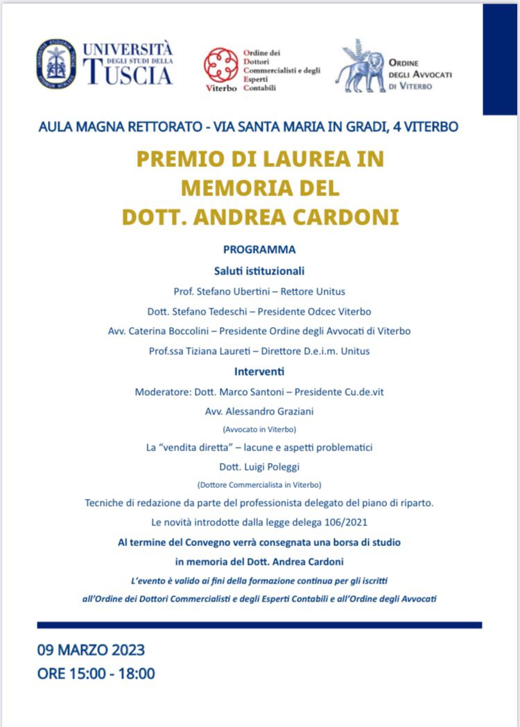 Giovedì 9 marzo, dalle ore 15.00 alle ore 18.00, presso l’Aula Magna del Rettorato dell’Università degli Studi della Tuscia, in via Santa Maria in Gradi 4, a Viterbo, si svolgerà un convegno organizzato dall’Ordine dei Dottori Commercialisti e degli Esperti Contabili e dall’Ordine degli Avvocati, al termine del quale verrà consegnata una borsa di studio in memoria del dottor Andrea Cardoni, scomparso esattamente un anno fa, in seguito a un incidente stradale avvenuto nel quartiere viterbese del Pilastro.