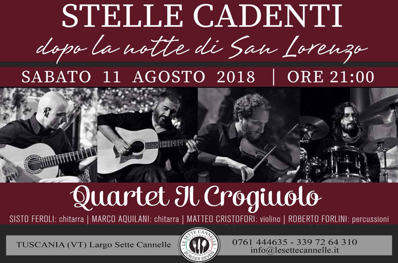 Dopo la notte di San Lorenzo a riveder le “Stelle Cadenti”  a Tuscania l’11 agosto alle ore 21.00, accompagnati dalla musica de  il Quartet Il Crogiuolo (Sisto Ferioli chitarra, Marco Aquilani chitarra, Matteo Cristofori violino, Roberto Forlini percussioni).