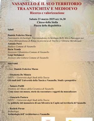“Vasanello e il suo territorio tra antichità e medioevo. Ricerca e valorizzazione”.L’incontro si terrà sabato 23 marzo prossimo alle 16.30, presso la Chiesa della Stella in piazza della Repubblica, è organizzato dal Comune in collaborazione con la cattedra di Archeologia Medievale dell’ Università degli Studi della Tuscia di Viterbo.