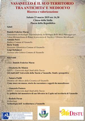 Successivamente, con il coordinamento di Daniele Federico Maras interverranno Elisabetta De Minicis (Docente di Archeologia Medievale presso l’Università degli Studi della Tuscia di Viterbo), Tamara Patilli (Direttore Scientifico Museo della Ceramica di Vasanello), Giancarlo Pastura (Università degli Studi della Tuscia) e l’archeologa Rachele Pavan. .