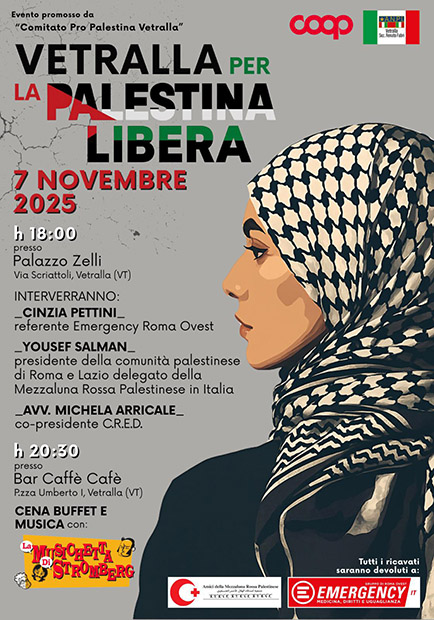 Venerdì 7 novembre, alle ore 18.00, Palazzo Zelli, in via Scriattoli, a Vetralla, ospita l’incontro organizzato dal Comitato Pro Palestina Vetralla con gli interventi di Cinzia Pettini, referente di Emergency Roma Ovest, Yousef Salman, presidente della comunità palestinese di Roma e Lazio, delegato della Mezzaluna Rossa Palestinese in Italia e l’avvocata Michela Arricale, copresidente del Centro di ricerca ed elaborazione per la democrazia (CRED).