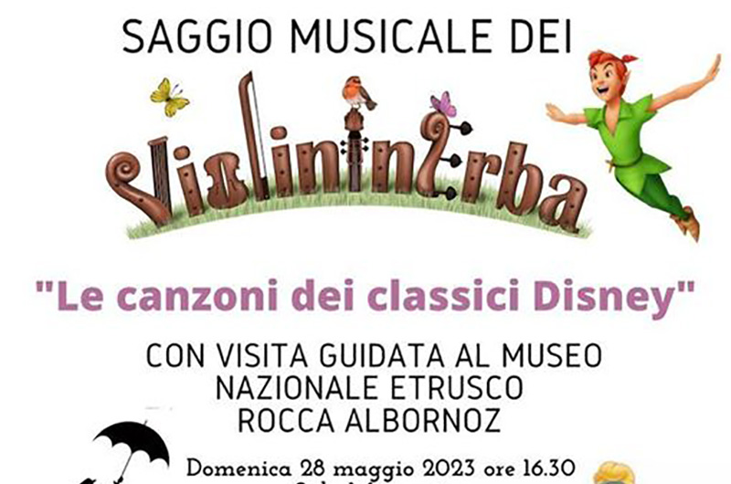 L’ Accademia degli S.Vitati presenta il saggio musicale dei Violinisti in erba ne Le canzoni dei classici Disney, domenica 28 maggio alle 16.30 presso la Sala Mezzanino – piazza della Rocca 21b, Viterbo al Museo nazionale etrusco Rocca Albornoz,A seguire la