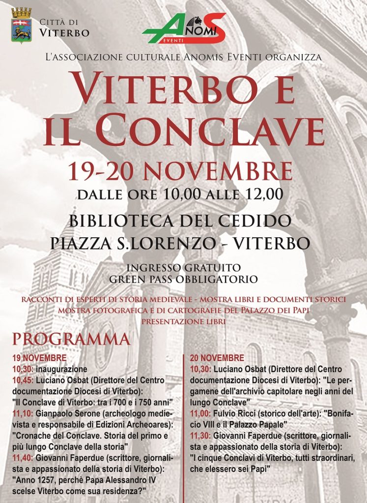 In occasione della ricorrenza dei 750 anni del primo conclave viterbese, l’Associazione Culturale Anomis Eventi organizza l’iniziativa “Viterbo e il Conclave” che si svolgerà il 19 e 20 novembre presso la Biblioteca del Ce.Di.Do (Centro Diocesano di Documentazione) in piazza S. Lorenzo a Viterbo.