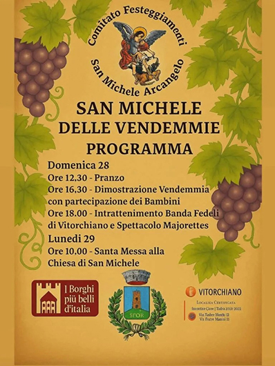 A Vitorchiano per la ricorrenza di San Michele delle Vendemmie, domenica 28 e lunedì 29 settembre, il Comitato San Michele Arcangelo organizza vari festeggiamenti e un pranzo sociale, nei locali dell’ex Convento del Complesso Sant’Agnese.