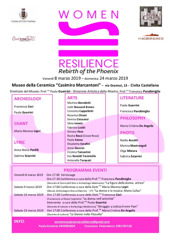 Resilienza quindi come capacità di reagire, senza mai lasciarsi abbattere dalle difficoltà quotidiane, e rialzarsi più forti di prima, tema che sarà interpretato da 15 artiste, le quali si esprimeranno attraverso i linguaggi della pittura, dell’incisione, della grafica, della scultura, della Video Art, della Digital Art e da 10 professioniste, che utilizzeranno i temi dell’archeologia, della letteratura, della poesia, della filosofia e della fotografia per evidenziare l’importanza della resilienza come forma di riscatto dell’animo femminile e mezzo per la conquista del rispetto. “Lo spazio che ospiterà l’evento diventerà il simbolo della fenice che rinasce dalle proprie ceneri”.