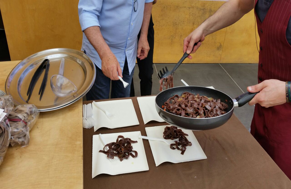 E alla fine la prova pratica sul campo. “Al termine dello show cooking abbiamo fatto degustare le nostre fettuccine al cacao ai partecipanti. La ricetta? Semplice e tradizionale, in modo da esaltarne il sapore: aglio e olio con guanciale, trito di bacche di goji, pecorino romano e rucola fresca”.