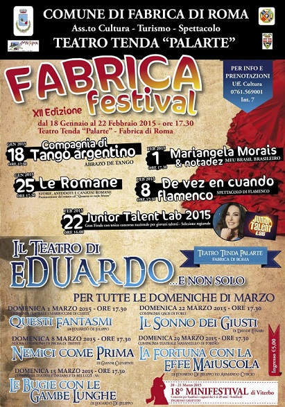 Al via la XII edizione del Fabrica Festival promosso dall’Assessorato della Cultura del Turismo e dello Spettacolo del Comune di Fabrica di Roma. Dal 18 gennaio al 29 marzo 2015 numerosi appuntamenti alterneranno musica e teatro al Teatro Tenda “Palarte”.