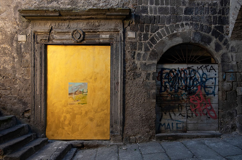 E infine è proprio nel cuore del quartiere multietnico di Viterbo che si torna. Le impressioni pittoriche raccolte in loco durante il trekking all’Arcionello sono poi confluite nel dipinto di “Porta d’oro” e che rappresenta, appunto, la Palanzana: l’altrove paesaggistico, il monte per antonomasia di ogni viterbese è stato ricollocato da Bellonono in un luogo improprio, producendo un effetto di magica sorpresa. La scelta di inondare lo sguardo dello spettatore con un fondale coloro oro, “evidente richiamo all’arte bizantina”, irride sacralmente alla vulgata su San Faustino come quartiere degradato. “E invece l’ho trovato piuttosto deserta”. Uno dei tanti luoghi in potenza, in attesa di redenzione.