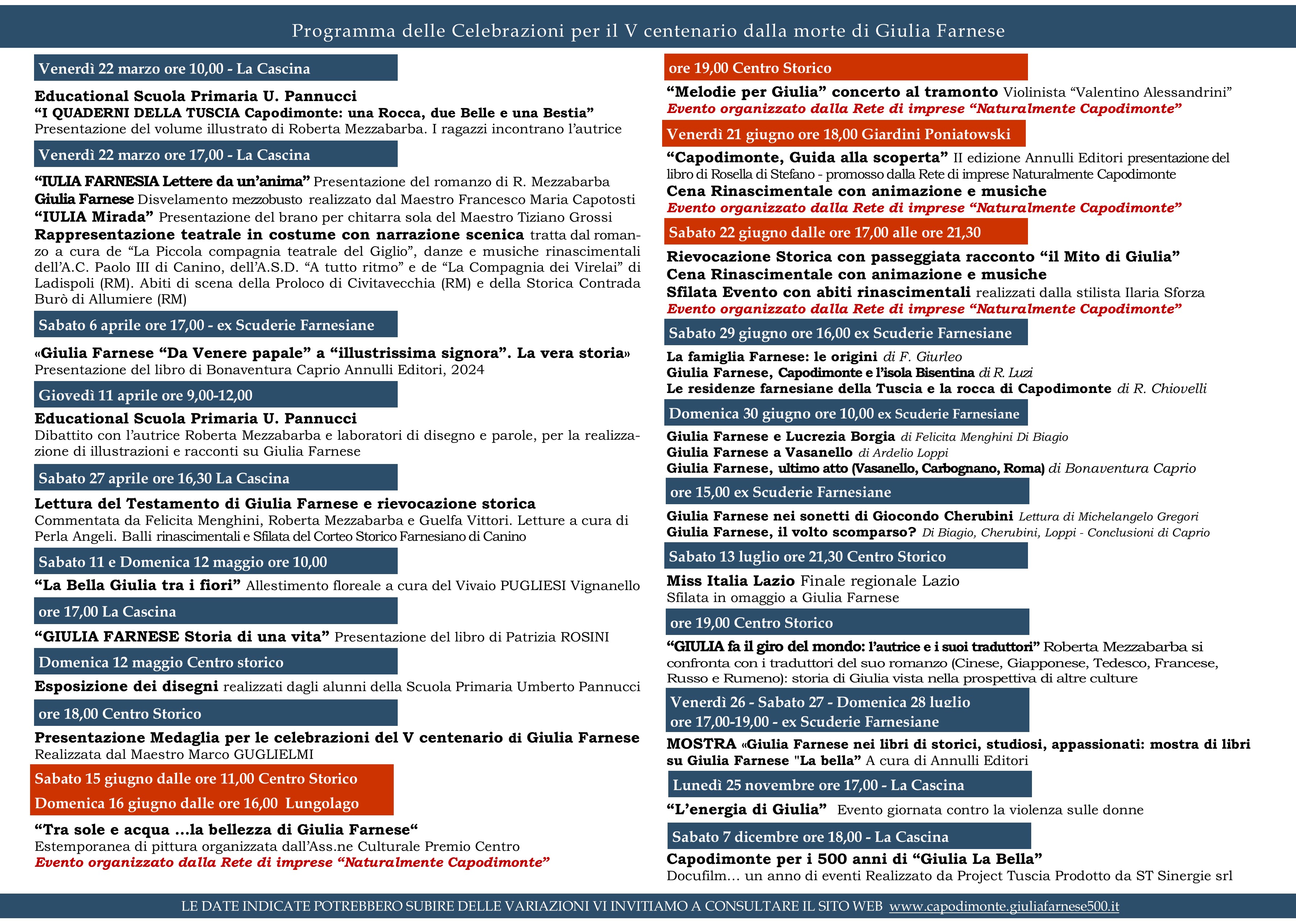 conferenze storiche, rappresentazioni teatrali in costume, concerti e molto altro ancora. Uno degli eventi salienti sarà la presentazione del mezzo busto di Giulia Farnese, realizzato dal rinomato scultore Francesco Maria Capotosti, presso La Cascina il 22 marzo.