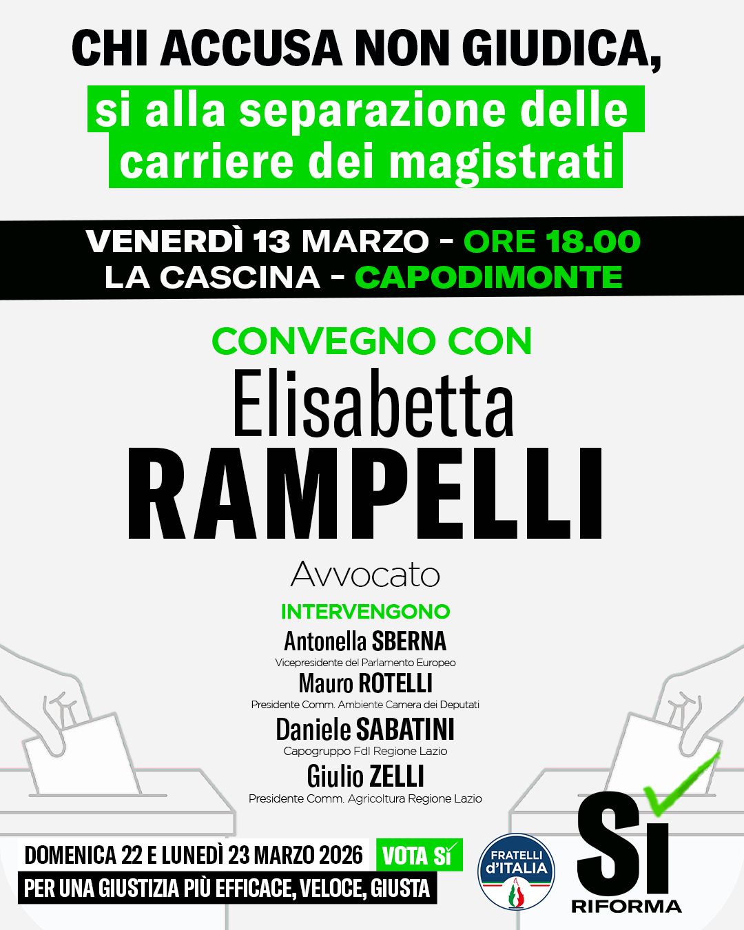 Momento importante sarà venerdì 13 marzo, alle ore 18, presso la Cascina di Capodimonte, dove si terrà un convegno con l’avvocato Elisabetta Rampelli, presidente dell’Unione italiana forense e da anni impegnata nella tutela dei diritti. Un appuntamento di approfondimento e confronto su un tema cruciale come quello della giustizia, al quale prenderanno parte gli onorevoli Mauro Rotelli e Antonella Sberna, insieme ai consiglieri regionali Daniele Sabatini e Giulio Zelli.