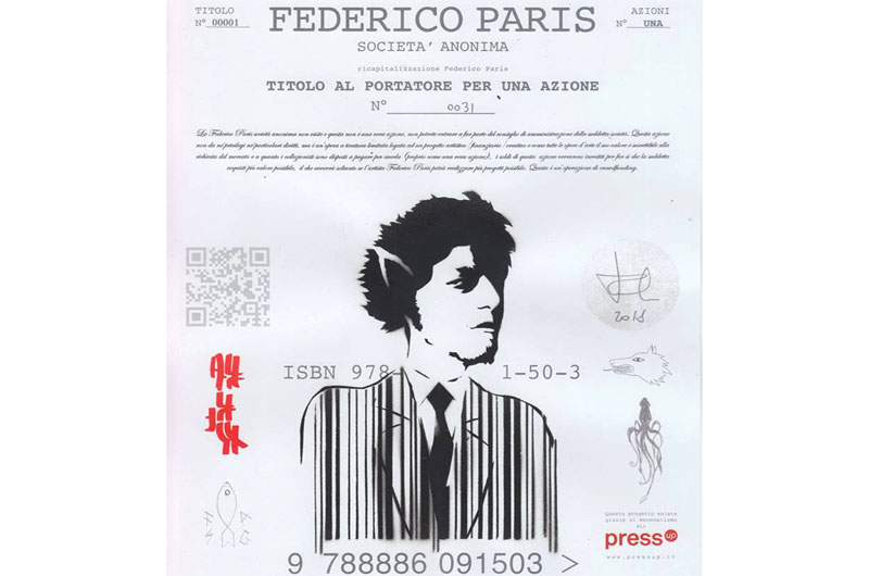 La Federico Paris società anonima non esiste e questa non è una vera azione, non potrete entrare a far parte del consiglio di amministrazione della suddetta società. Questa azione non dà né privilegi né particolari diritti, ma è un’opera a tiratura limitata legata ad un progetto artistico/finanziario/creativo e come tutte le opere d’arte il suo valore è suscettibile alla richiesta del mercato e a quanto i collezionisti sono disposti a pagare per averla (proprio come una vera azione), i soldi di questa azione verranno investiti per far sì che la suddetta acquisti più valore possibile, il che avverrà soltanto se l’artista Federico Paris potrà realizzare più progetti possibile. Questa è un’operazione di crowdfunding.