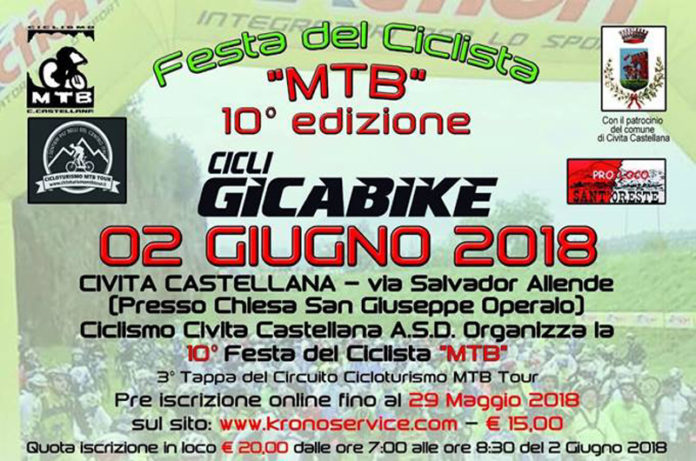 La cicloturistica “Festa del Ciclista MTB” è una manifestazione di mountain bike non agonistica organizzata dalla CICLISMO CIVITA CASTELLANA A.S.D. arrivata alla X edizione. Si svolgerà sabato 2 Giugno con ritrovo a Civita Castellana (VT), Via Salvador Allende, presso la Parrocchia di San Giuseppe Operaio.