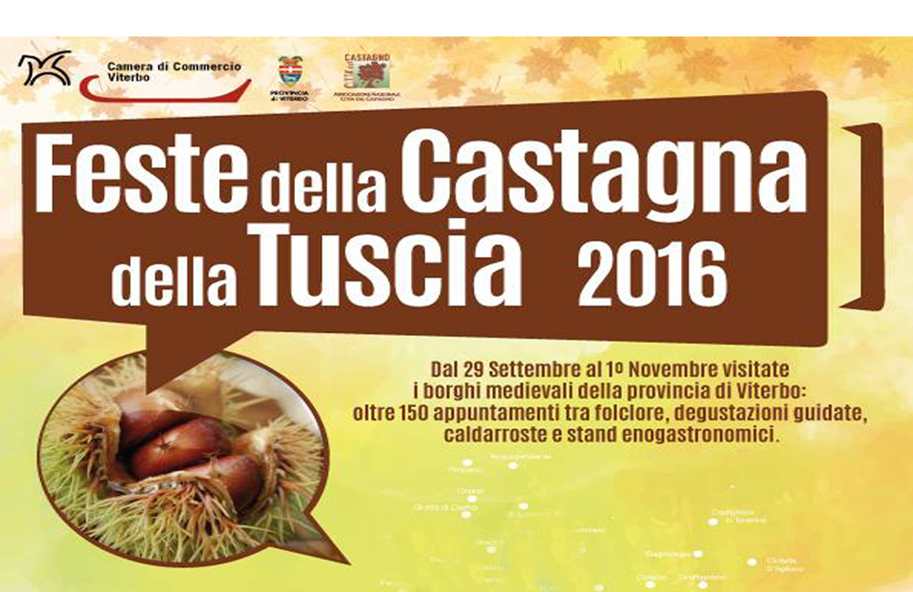 Le iniziative legate alla Festa della Castagna dureranno per circa un mese, partite dal  29 settembre e via diritti fino al primo novembre. Sei i comuni coinvolti per un totale di 150 appuntamenti tutti mirati a rinnovare le tradizioni legate alla castagna che nella Tuscia vantano quasi un secolo e mezzo di vita. Questi i Comuni protagonisti: Soriano nel Cimino(29 settembre-15 ottobre con il Convivium), Canepina(15-30 ottobre), Vallerano (8 ottobre-1° novembre), San Martino al Cimino (15-23 ottobre), Latera(22-30 ottobre), Caprarola (8-16 ottobre).
