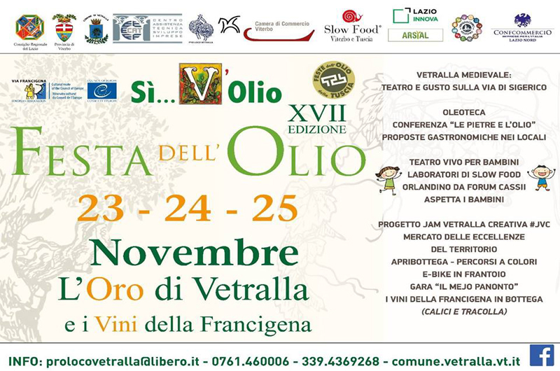 Venerdì 23, Sabato 24 e Domenica 25 Novembre 2018 si svolgerà a Vetralla la XVII edizione della Festa dell’Olio: L’Oro di Vetralla