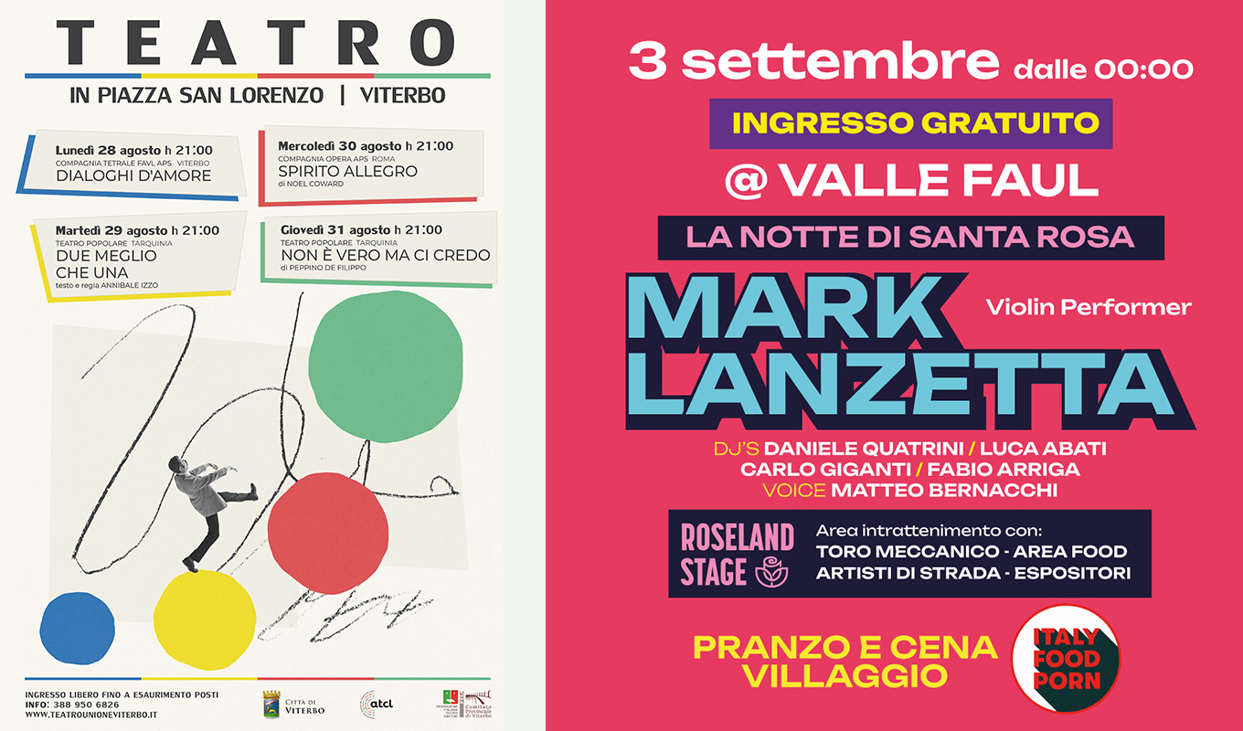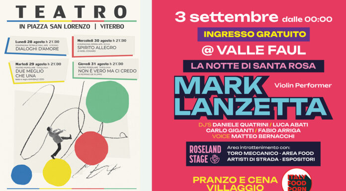 Ancora suoni, balli, teatro popolare, fast food, teatro di strada con gli Artisti in rosa “pedalando tra le piazze”, nel centro storico di Viterbo per le festività di Santa Rosa. “Un’altra batteria di avvenimenti”, annuncia la sindaca Chiara Frontini in conferenza stampa – l’ennesima – che si tiene a mezzodì a Palazzo dei Priori. Un autentico bombardamento di manifestazioni. Mancherà anche quest’anno, quello letterale e tradizionale dei fuochi di artificio a porta Faul, sito che invece sarà destinato soprattutto alla musica e all’enogastronomia. Per tutti i gusti e per tutte le età.Alla conferenza stampa di questo lunedi mattina  sono intervenuti la sindaca Chiara Frontini e l’assessore alla cultura e all’educazione Alfonso Antoniozzi, il presidente provinciale Fita Bruno Mencarelli, Francesco Schirripa e Mattia Marcucci per Viterbo Future Festival. Presenti anche i consiglieri comunali Umberto Di Fusco e Giancarlo Martinengo. Presente inoltre Andrea Maurizi, in rappresentanza di ATCL per appuntamenti FITA. Un programma rapidamente esplicitato e fitto che è difficile riportarlo integralmente sul taccuino degli appunti. Niente paura, il menù completo arriverà a conferenza già finita e sarà comunque reso pubblico. “Quello che presentiamo questa mattina è un secondo blocco di eventi”, precisa il vice sindaco e assessore alla Cultura, Alfonso Antoniozzi. Che poi li snocciola come grani di un lungo rosario: due giornate di teatro di strada nel centro storico; quattro serate il 28, 29, 30 e 31 agosto di spettacoli teatrali allestiti dalla Fita di Viterbo in piazza San Lorenzo (ingresso gratuito);Il 3 settembre dopo il trasporto della macchina di Santa Rosa ci si ritrova a Valle Faul per ballare fino a tarda notte, atteso Mark Lanzetta, violinista elettronico tra i più importanti al mondo(ingresso gratuito) Una scelta che vuol coinvolgere i giovani, rappresentati dagli organizzatori Mattia Marcucci e Francesco Schirripa di Viterbo Future festival . Valle Faul  diviene punto focale con musica rap, pop, e area food con punto ristoro nel Villaggio (L.C.)