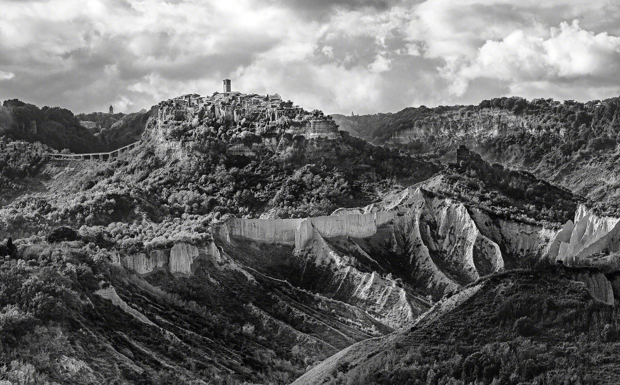 Le fotografie di Stanton mostrano anche lo straordinario paesaggio che circonda Civita. Stampate in suggestive tonalità di bianco e nero, queste immagini invitano lo spettatore a partecipare al dramma della roccia vulcanica profondamente fessurata e delle aride creste nelle valli argillose che caratterizzano la regione. Queste immagini sottolineano il ruolo che le particolari condizioni geologiche di Civita e della Valle dei Calanchi hanno svolto nello sviluppo della sua cultura unica e che sono alla base delle valutazioni che hanno portato alla candidatura de Il Paesaggio Culturale di Civita di Bagnoregio a Patrimonio dell’Umanità. Tutte le info sul percorso di candidatura sono consultabili su www.ilpaesaggioculturaledicivitadibagnoregio.it.