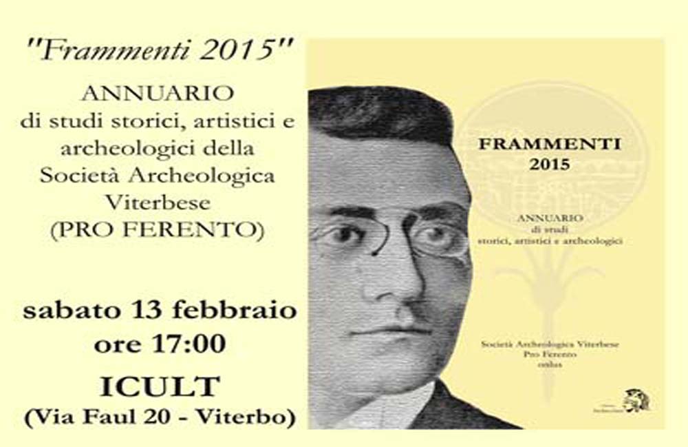 la casa editrice Edizioni Archeoares e l’associazione Pro Ferento presenteranno la nuova pubblicazione dell’annuario “Frammenti 2015”, riferito agli studi storici, artistici e archeologici della Società Archeologica Viterbese Pro Ferento.