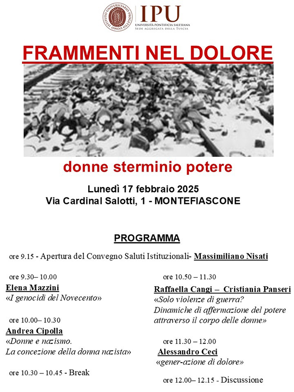 L’attività scientifica e di approfondimento promossa dal Centro Studi di Genere è proseguita, poi, nel seminario del 17 febbraio 2025 “Frammenti nel dolore. Donne Sterminio Potere”, organizzato in collaborazione con il Centro Sudi di Pedagogia Sociale dell’IPU, nel corso del quale la Professoressa Elena Mazzini ha affrontato il tema del genocidio ricordando gli episodi avvenuti nel secolo scorso. Il Professor Andrea Cipolla ha analizzato la concezione della donna all’epoca del nazismo; mentre le Professoresse Maria Raffaella Cangi e Cristiania Panseri hanno focalizzato il tema degli stupri di guerra e durante gli stermini di massa, soffermandosi sulle interpretazioni, le funzioni sociali ed i significati simbolici di questa forma di violenza. Infine il Professor Alessandro Ceci nelle conclusioni ha ripreso i vari interventi rileggendoli alla luce di una riflessione sul dolore.