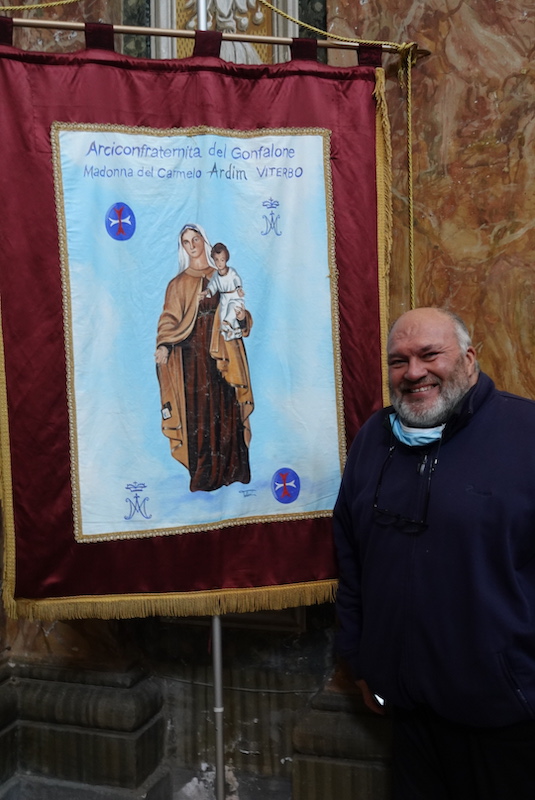 Franco Chiaravalli il nostro Quintaletto ci descrive con dovizia di particolari quanto ci circonda e siamo affascinati da tanta bellezza qui a due passi da casa nostra. La Chiesa di san Giovanni Battista del Gonfalone, è da considerare come l’esempio del barocco a Viterbo. A fine visita nell’accomiatarci dal nostro Priore già Facchino di santa Rosa siamo confortati che quanto ha visto luce sin dal XII secolo, rimanga custodito con lo stesso principio e la stessa devozione di culto di fine caritatevole e di coinvolgimento con la città. E gli auguriamo e ci auguriamo che lo scapolare di cui il nostro priore è stato investito sia emblema di un triduo di una tradizione in cui ritrovarci tutti insieme. Soprattutto il prossimo 16 luglio.