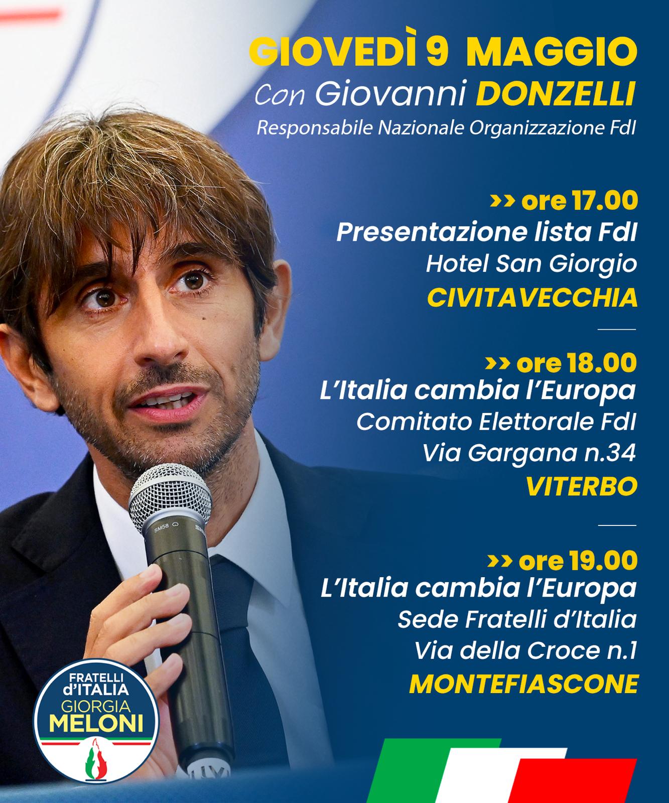 Il responsabile nazionale organizzazione di Fratelli d’Italia Giovanni Donzelli torna nella Tuscia domani, giovedì 9 maggio, con una serie di incontri per presentare i candidati al Parlamento europeo del collegio dell’Italia Centrale e incontrare gli elettori.