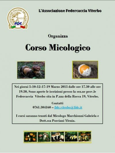 Per appassionati e per quanti ne vogliono fare materia di conoscenza La Federazione italiana della Caccia di Viterbo, organizza nei giorni 5-10-12-17-19 Marzo p.v. un corso micologico al fine del rilascio di attestato valido per la raccolta dei funghi.Per iscrizioni e/o chiarimenti recarsi in P.zza della Rocca 19 – Viterbo. Oppure chiamare il numero 0761-304160.Le iscrizioni sono già aperte