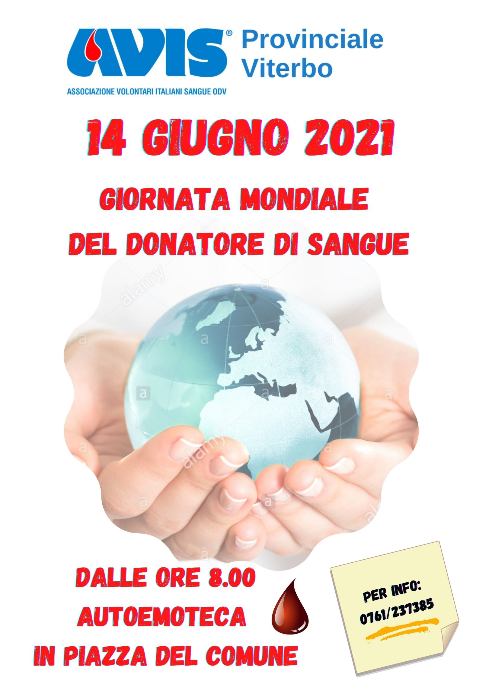 A partire dalle ore 8.00 l’Autoemoteca Avis sosterà in piazza del Comune a Viterbo per una raccolta straordinaria di sangue per dare la possibilità a tutti coloro che lo desiderano di donare il sangue comodamente in zona.