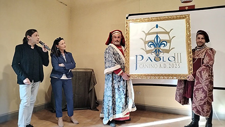 Ideatore dell’immagine stilizzata, mostrata al pubblico da due figuranti in abiti d’epoca, Bruno Morrotto, che ha spiegato: “Realizzare un logo per un personaggio così complesso non è stato facile, quindi ho voluto mettere in primo piano il giglio e l’unicorno, entrambi simboli farnesiani, e la tiara papale. I colori che ho scelto sono l’oro, che esalta la potenza della casata, e l’azzurro lapislazzulo, che lega Canino a Roma, in quanto è una tonalità presente negli affreschi eseguiti da Michelangelo nella cappella Paolina, proprio su commissione di Papa Paolo III, che notoriamente fu anche un grande mecenate”.