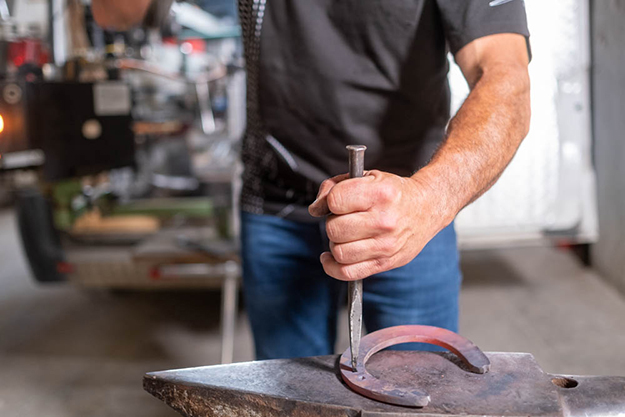 Il classico ferro di cavallo, a forma di U, rimane nell’immaginario collettivo, come portafortuna. Era uno strumento indispensabile nel passato, per ferrare cavalli o muli, rendendoli idonei ad un uso intensivo, senza il possibile consumo degli zoccoli. Chi pensa che oggi l’antico mestiere del maniscalco sia scomparso, si sbaglia. Si sbaglia anche chi pensa che il maniscalco si limiti a mettere i ferri al cavallo. Ne abbiamo avuto la riprova arrivando a Monteromano. Si ode il rumore della forgia, con i suoi milleseicento gradi, l’incudine che “canta” sotto i colpi ben assestati di Sante il maniscalco, all’occhio dell’osservatore il metallo rosso incandescente perde squame di metallo per compattarsi e indurirsi sotto i colpi del martello e prende forma lentamente in un ferro che andrà a sovrapporsi allo zoccolo del cavallo come un guanto.