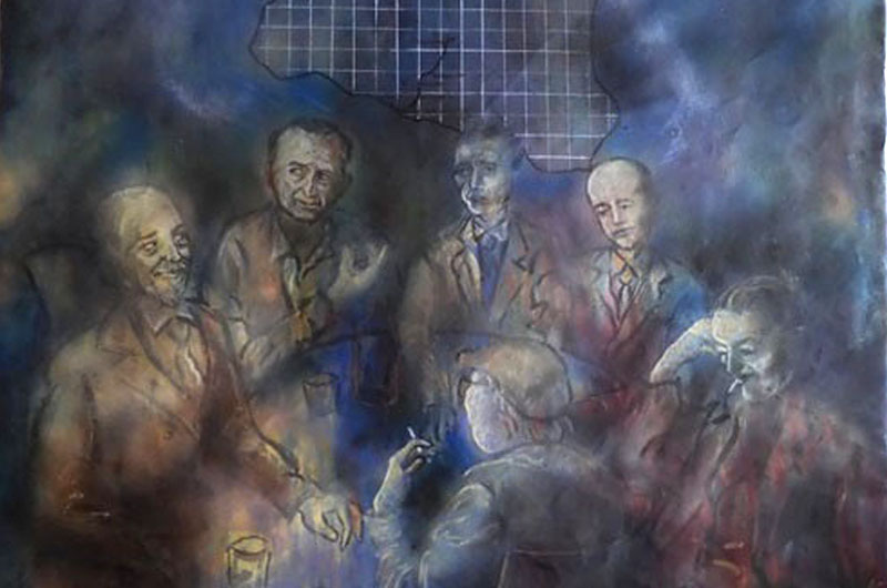 Il tempo misurabile deve differire da quello psicologico, in cui l’uomo, l’artista nel suo cammino, è alla ricerca di nuove frontiere da superare. Un tempo, che sia umano, ma anche a volte soprannaturale è consequenziale con l’intensità con cui lo spazio visivo è rivissuto e condiviso. Guadagnuolo trae dai libri degli scrittori una riflessione che ci porta a pensare a questi straordinari personaggi che amano la letteratura e la Sicilia calandoli nelle realtà umane di ciascuno. L’artista riesce ad ideare la scena come viva ed i personaggi esordiscono occupando lo spazio l’uno dell’altro partecipando alla Tavola rotonda. Immaginazione ed esistenza, ragione e verità, si conglobano con la storia in un avvicendamento di visioni che Guadagnuolo è riuscito a sviluppare, con pennello abile, nel comporre l’insieme.