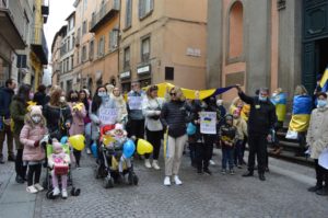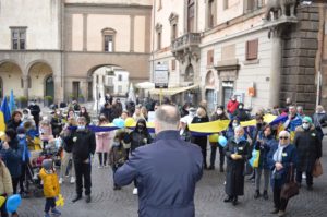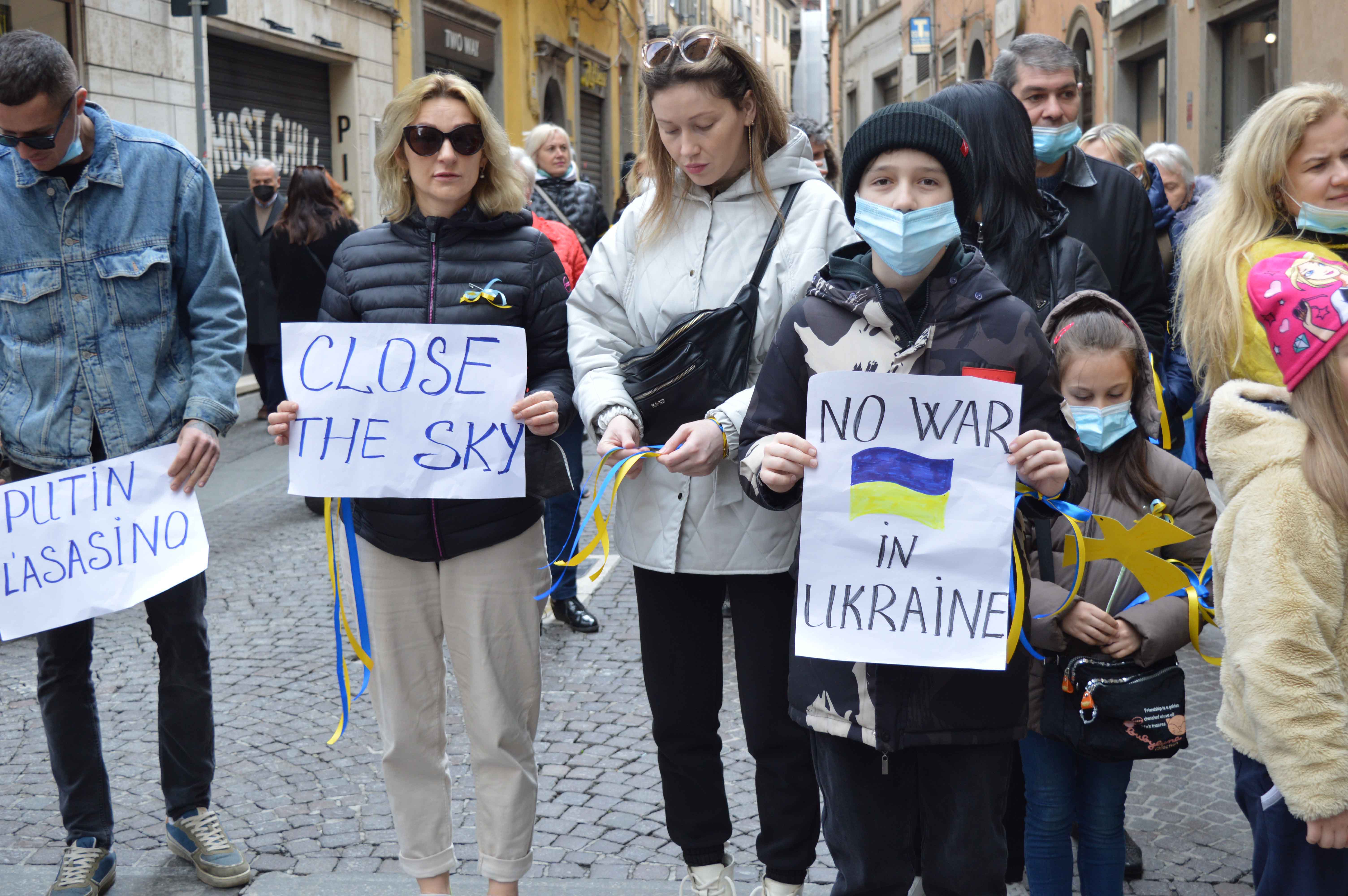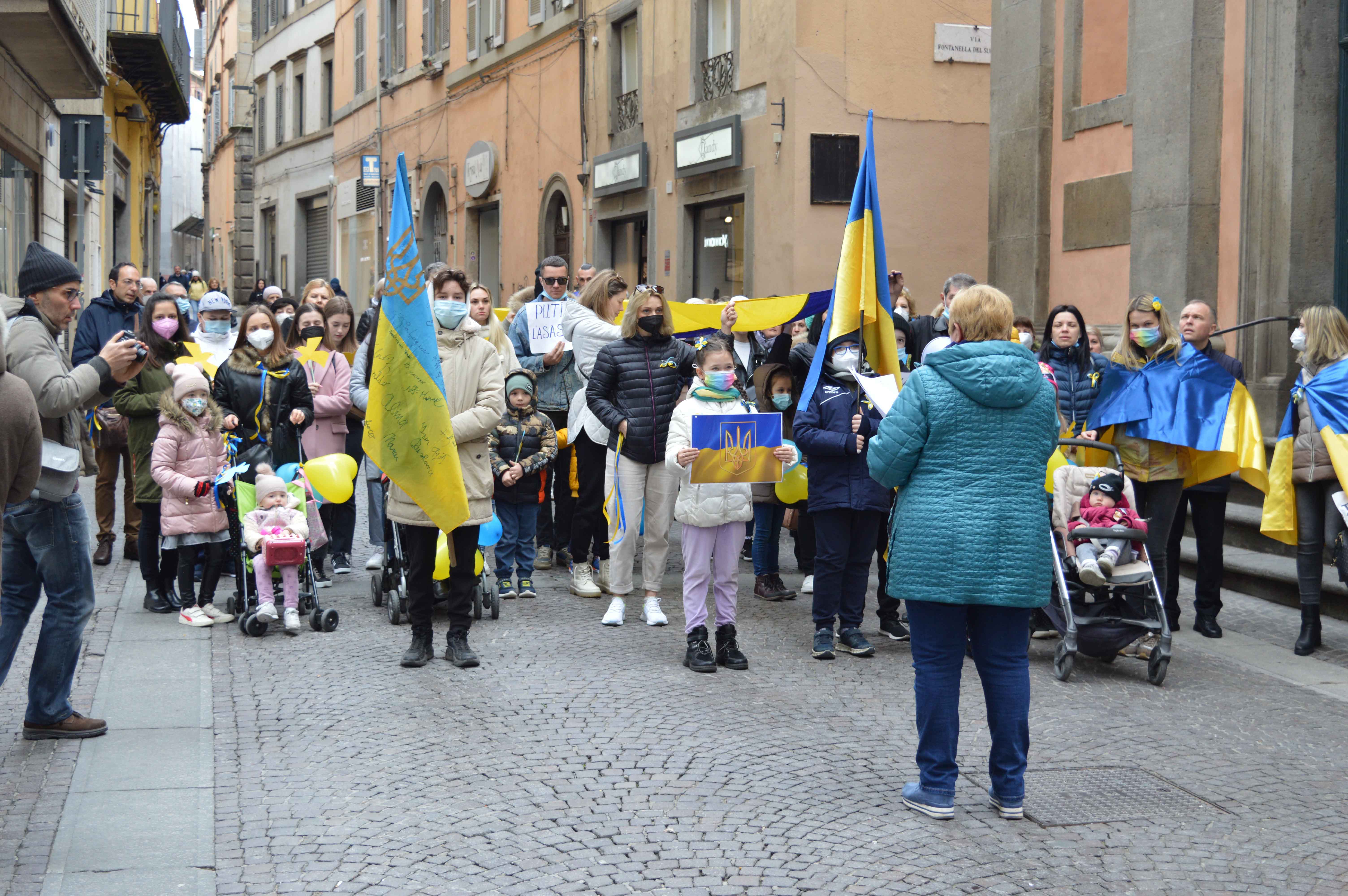 “No war in Ukraine” dice un altro cartello tenuto in mano da un bambino. E il grido “Ucraina libera” risuona a ritmo continuo durante il tragitto che percorre corso Italia, piazza delle Erbe e via Roma, per sostare davanti alla chiesa di Sant’Angelo in Spata, in piazza del Comune.