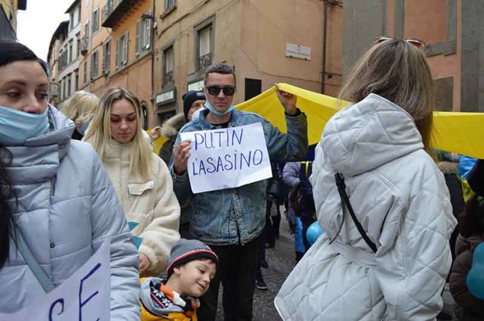 Su un cartello c’è scritto: “Putin l’asasino”. Sì, asasino, con una esse sola. Ma tant’è. L’errore di ortografia si può tranquillamente perdonare a questa gente, nei cui occhi si può scorgere tutta la disperazione che stanno vivendo per quanto sta accadendo nella loro terra d’origine. Erano meno di un centinaio ieri mattina gli ucraini che hanno voluto sfilare in corteo, partendo dalla chiesa del Suffragio, per le vie del centro storico di Viterbo. Composti, dignitosi, ma allo stesso tempo angosciati e quasi increduli di fronte alla strage di vite umane cui stanno assistendo. Molti di loro hanno parenti a Kiev, a Leopoli, a Mariupol, laddove i missili arrivano a raffica e uccidono. Missili tutt’altro che intelligenti, giacché colpiscono militari e civili. Uomini, donne e anche bambini.