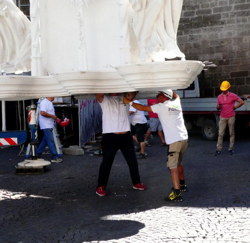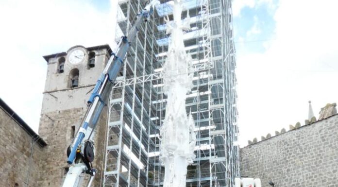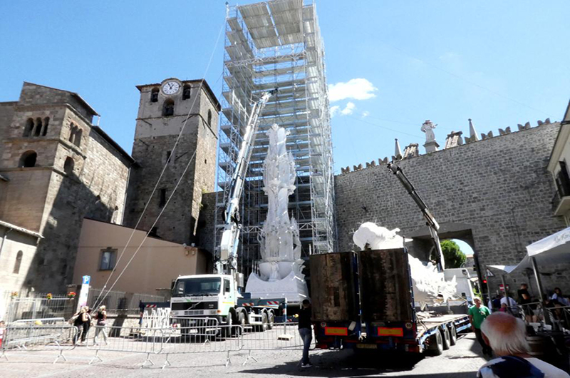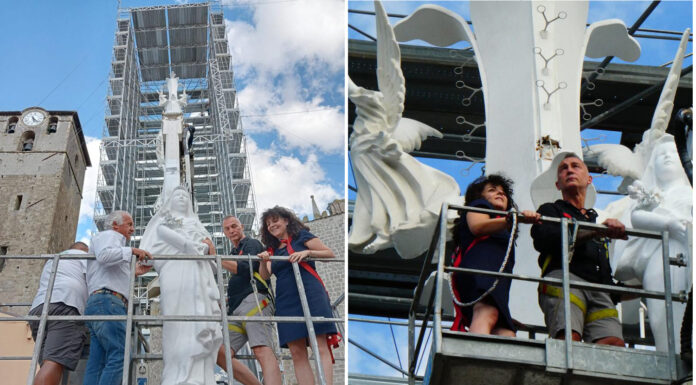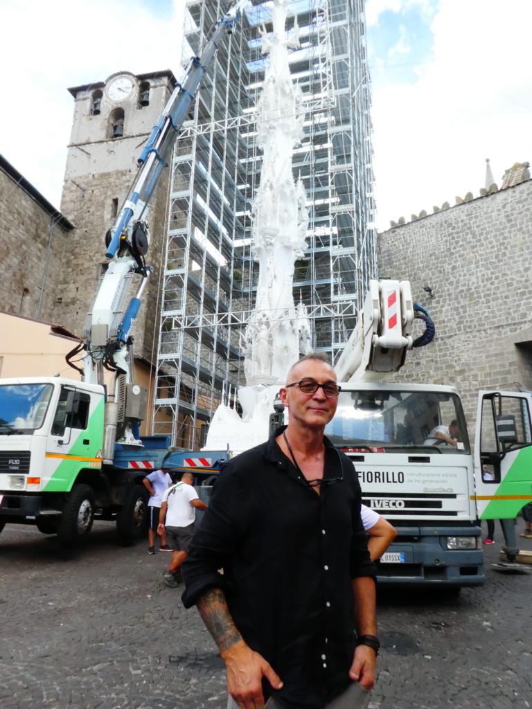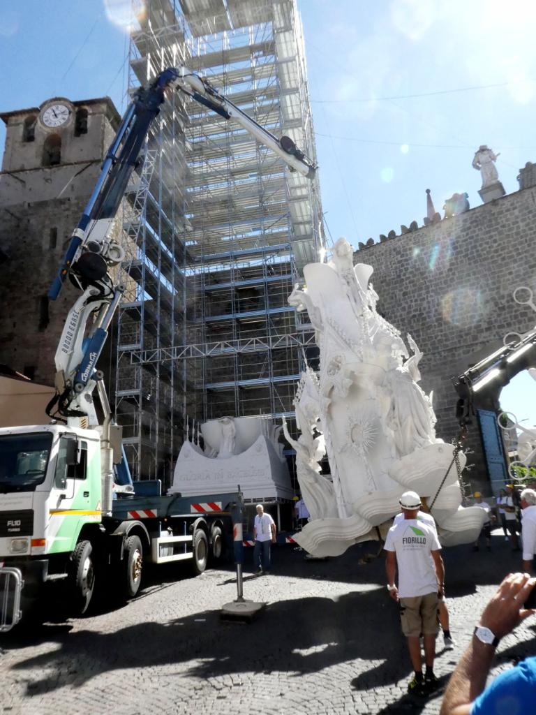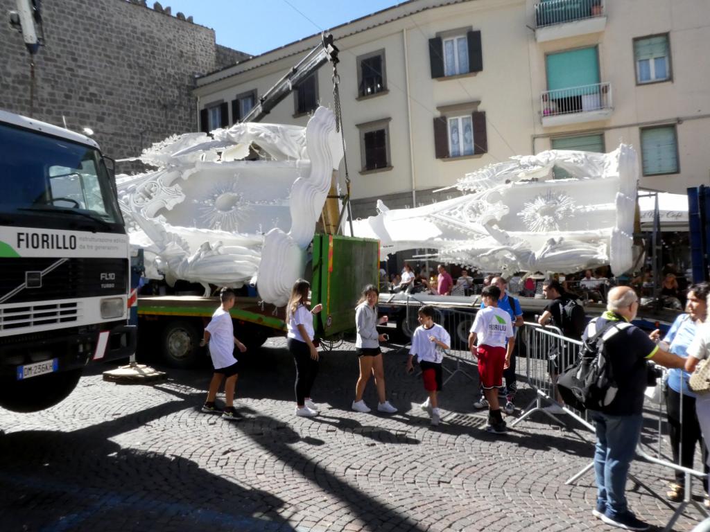 Dopo un fermo di due anni causa pandemia, Gloria l’attesissima “Macchina” dei viterbesi, torna questo mercoledì 24 agosto nel luogo da cui la sera del 3 settembre prenderà avvio il Trasporto. Il viaggio di attraversamento della città, dal cantiere Fiorillo da cui è partita, ha visto la sosta in piazza del Comune, dove è stata  accolta dalla sindaca Chiara Frontini, dall’assessora alle politiche sociali Patrizia Notaristefano, da Alessandra Croci consigliera delegata alla via francigena e giubileo 2025, dal capogruppo Giancarlo Martinengo, nonché dal presidente del Sodalizio dei facchini Massimo Mecarini e dal costruttore Vincenzo Fiorillo. L’assemblaggio è in corso e dovrebbe concludersi a metà pomeriggio. Un pubblico fedele a questo rituale è attento nella ricerca di qualche elemento innovativo, tra i presenti una signora a voce alta si lascia scappare: “Certo ogni pezzo, seppur privo di decoro, è un merletto”. Il suo ideatore Raffaele Ascenzi ha annunciato delle novità che vedremo il 3 settembre. Stasera ci sarà da parte del vescovo la Benedizione della Statua. La sindaca, al suo debutto, ha sfoggiato un nuovo look. Tutti presi da Gloria, che si prepara al suo ultimo passaggio.