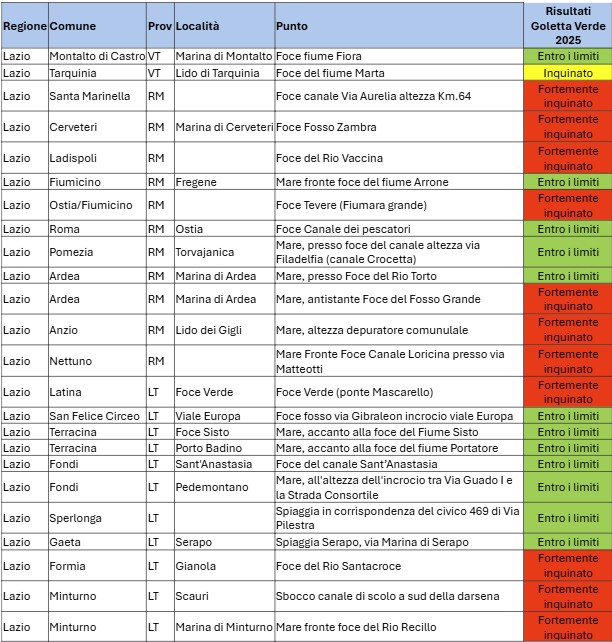 Entro i parametri di legge limiti sono risultati: in provincia di Viterbo la foce del fiume Fiora; in provincia di Roma, il punto a mare, fronte foce del fiume Arrone, a Fregene, la foce del canale dei Pescatori a Ostia e il mare, presso la foce del canale Crocetta, all’altezza di via Filadelfia a Torvajanica nel comune di Pomezia. Entro i limiti anche il prelievo a mare, presso la foce del Rio Torto a Marina di Ardea.