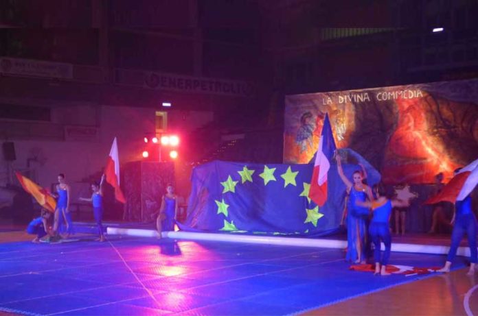 Sabato 14 ottobre in occasione della chiusura dei festeggiamenti del 65’ anniversario della costituzione del Centro Provinciale sportivo Libertas di Viterbo, il Palamalé ha ospitato uno spettacolo nello spettacolo. L’ASD Free sport Libertas ha messo in scena un vero e proprio musical unico nel suo genere “sport e arte”. Ad aprire la serata una rivisitazione del saggio “un giro intorno al mondo”: i paesi europei, la grande bandiera che li rappresenta le stelle che prendono vita…. Gli ospiti che si susseguono poi sono tutti di rilievo, dalla scuola di danza Dinamica, alle ali di Iside nella Danza del Ventre della Dancero Studio, al mix di forza, eleganza e potenza tutte racchiuse nell’esibizione degli Extreme Area. L’acrobatica aerea ci ha incantato con le sue performance al trapezio e al tessuto ed infine la Muay Thai con la sua Ram Muay, danza particolare che presenzia il combattimento. Poi il momento più atteso. Colori costumi, luci. Lo sport che si mette a servizio dell’arte e così gli atleti della Free Sport Libertas, dai più piccoli ai più grandi, attraverso una coreografia inedita hanno interpretato i personaggi illustri della divina commedia.