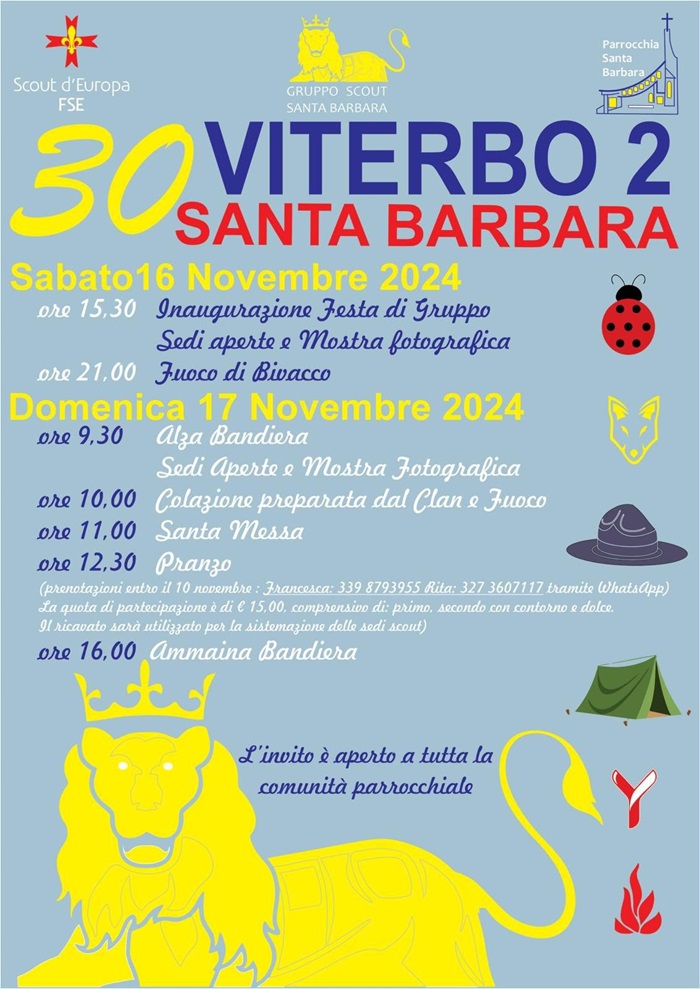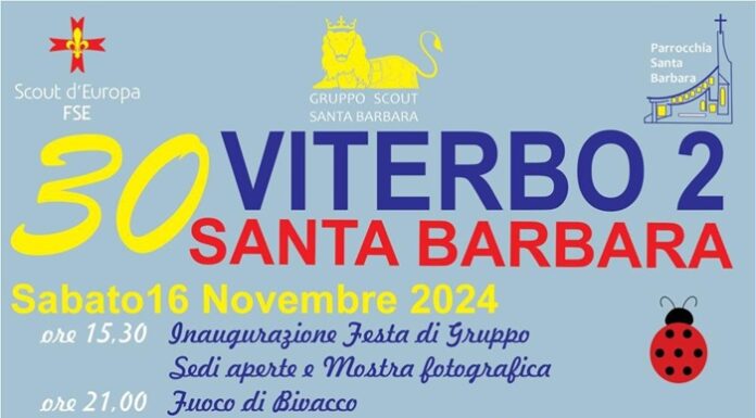 Trent’anni dopo. il Gruppo Scout F.S.E. Viterbo 2 Santa Barbara è oggi un gruppo completo che presenta tutte le branche associative, tra cui anche quelle delle ragazze e dei ragazzi più grandi: Scolte e Rover. Sono infine presenti una ventina di capi scout formati, gli R-S., che nel corso degli anni sono rimasti all’interno della compagine associativa ed offrono, a vari livelli, servizio al Gruppo ed in Parrocchia, mettendo a disposizione il proprio tempo, esperienze e talenti.