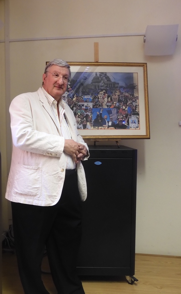 Osservando l’opera è divisa in due, con due luminosità diverse ci riportano in due diversi scenari temporali, pregni d’inquietudine politica. Non c’è geometria prospettica, perché mi sono servito di differenti rilevatori spaziali, una sorta di prospettiva aerea da consentire di fondare la percezione di lontananza e vicinanza fissando un tempo sospeso tra passato e presente. La lontananza, la parte alta, è data dall’assalto anti-democratico a Capitol Hill, mentre la vicinanza, la parte bassa, è data dall’attentato a Trump. Ho scelto la tecnica del collage la quale mi ha aiutato a concepire questa composizione spaziale trans-reale dove un tempo passato diventa presente e un tempo presente diventa passato. Tale archetipo di aggressioni agita per lo più la speranza nelle istituzioni e nella struttura democratica dello Stato. Creano disgregazioni profonde e peggiorano la crisi nelle società. Ai lati la folla riprende con tablet e cellulari in collegamento con altre persone. Vi sono poi le immagini di Putin e Netanyahu indicatori delle due guerre in corso che non sappiamo come andranno a finire, che seguite nel mondo con ansia potrebbero portare ad un conflitto globale. Si notano le prime pagine di alcuni quotidiani italiani che descrivono i fatti. Al centro, in alto, la statua della Libertà con un cielo tempestoso, inneggia il vero spirito degli ideali di libertà e di giustizia di una vera democrazia che sembrano aver perduto gli americani in mezzo alla divisione del Campidoglio».